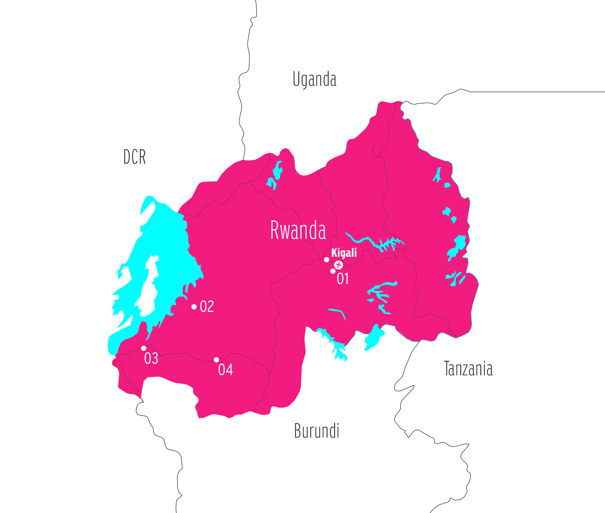 You’ll find us in the Southern and Western provinces, as well as in the capital, from a quiet Kigali suburb to the ancient Nyungwe rainforest.